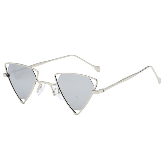 These stainless steel sunglasses feature a unique triangular shape with a reflective silver finish that...