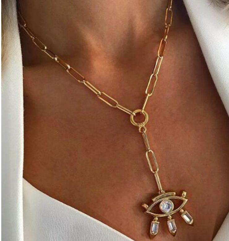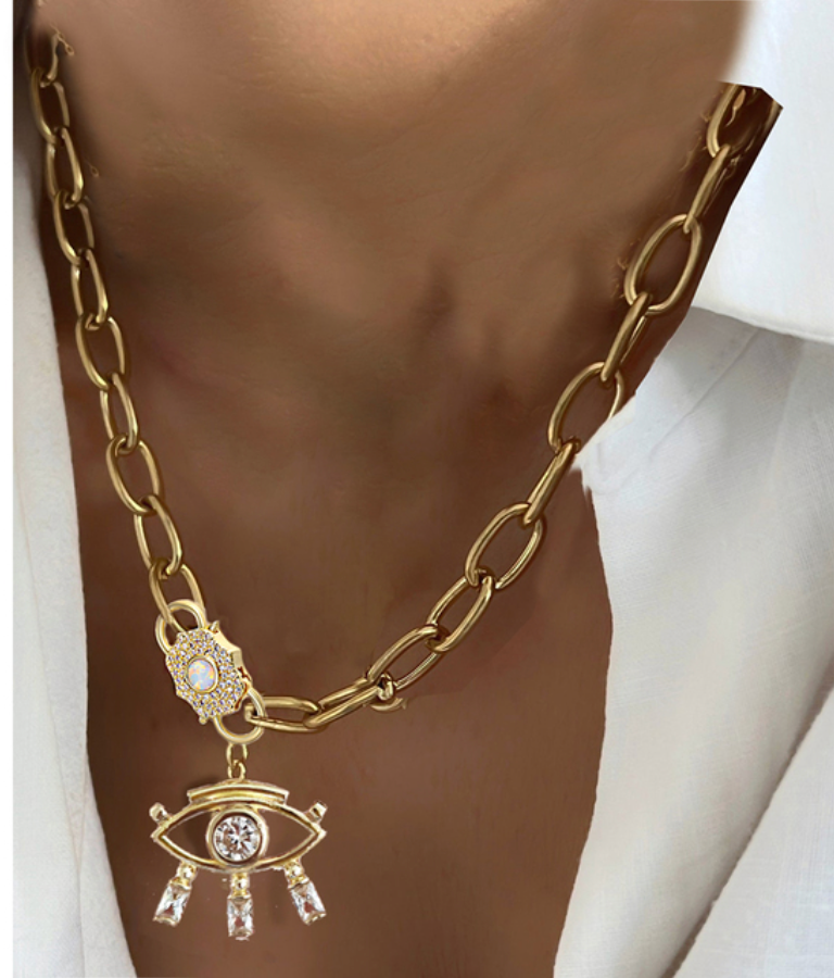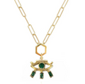This Amira Necklace features a dazzling design, crafted from gold plating and set with luxurious high grade cubic zirconia. A captivating piece to add subtle style and elegance to any look. An enchanting eye-catching evil eye motif serves as a protective charm while enhancing any ensemble.