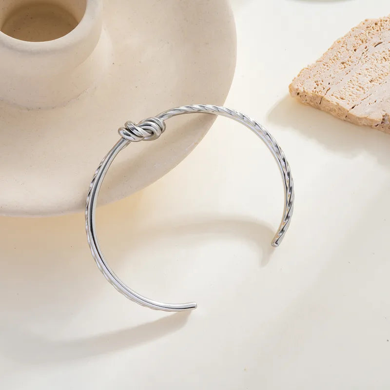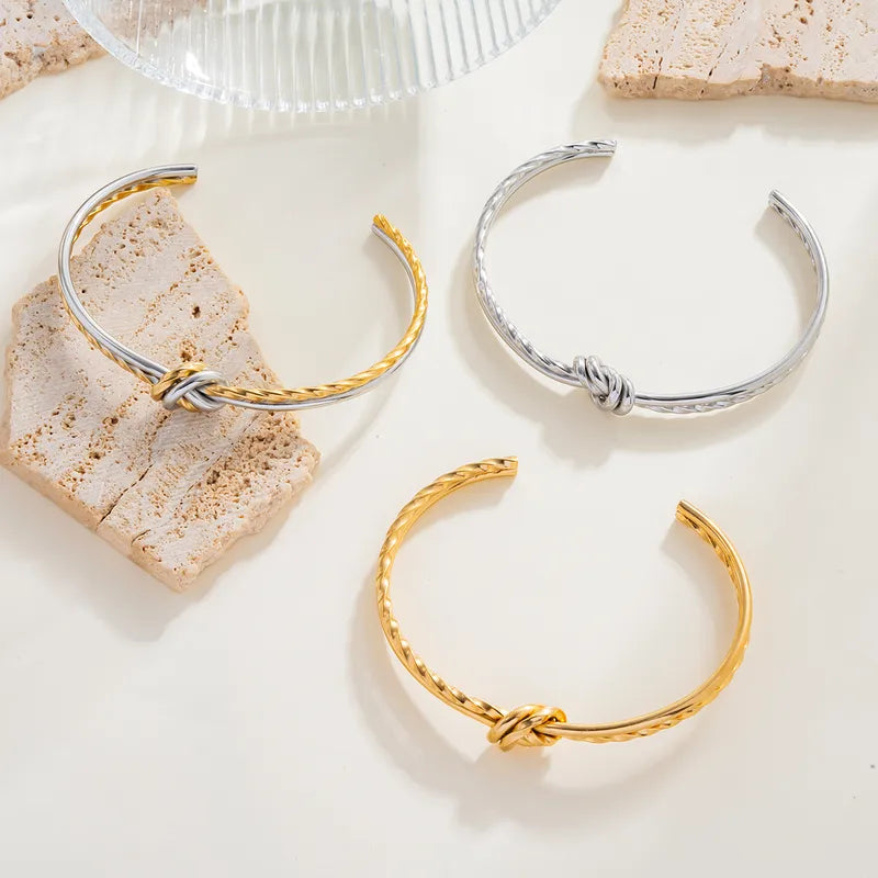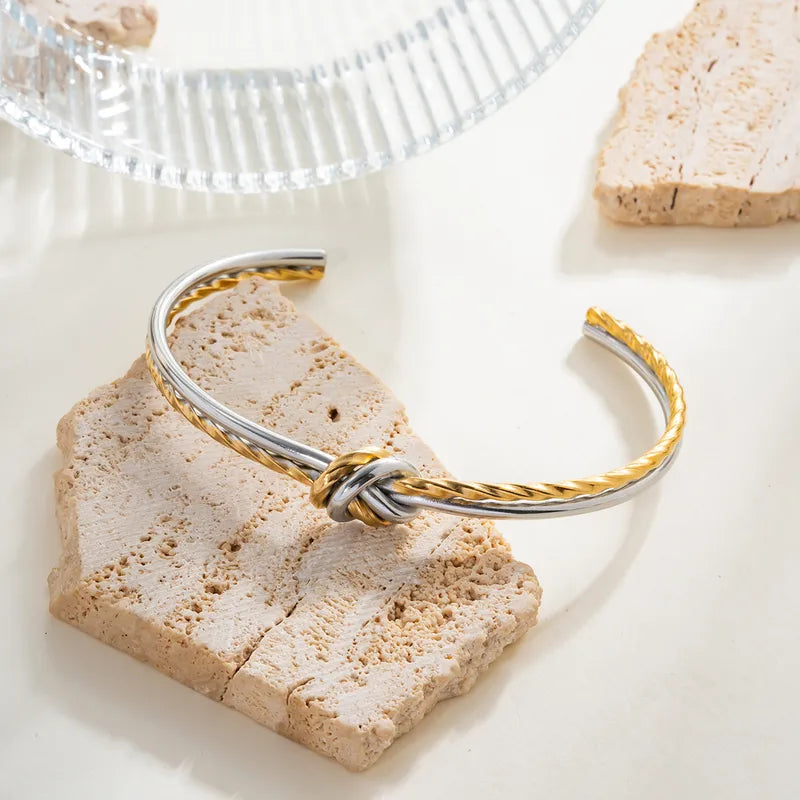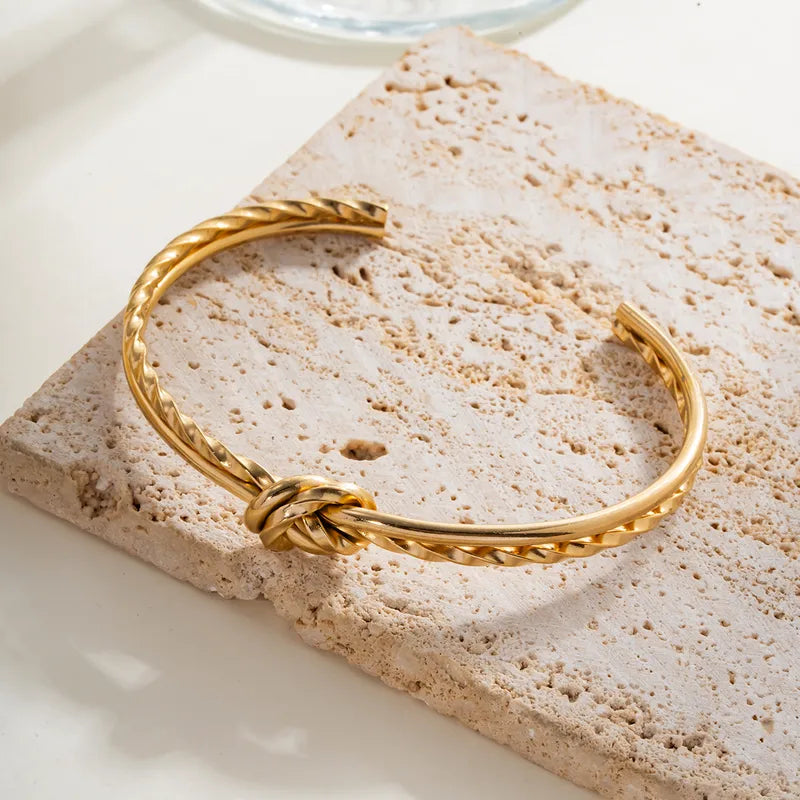 Add a touch of charm to your wrist with the Jean bangle—a gold-plated double line knot bangle that’s as playful as it is elegant. Its sleek design and delicate knot detail make it perfect for stacking or wearing solo to brighten any outfit with a hint of sparkle and fun.