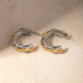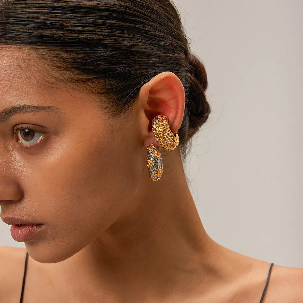 Make a bold statement with these oversized floral motif earrings featuring a textured gold-plated hoop. Their playful design adds a touch of whimsy and elegance, perfect for brightening up any outfit with a splash of floral charm.